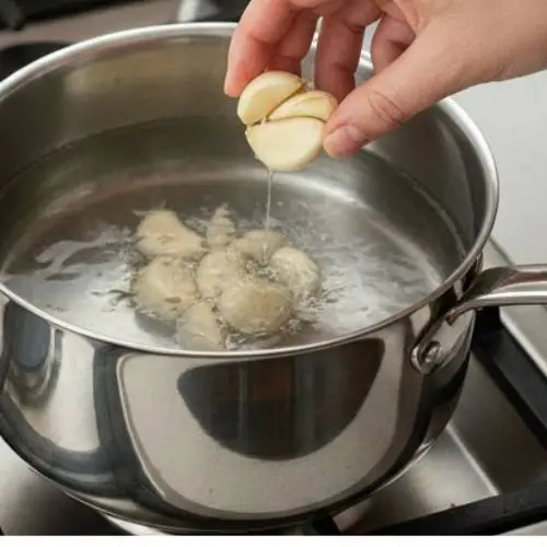 In a medium saucepan, pour in 2 cups of water and bring it to a boil. While the water heats up, separate the garlic cloves from the heads (no peeling needed). Carefully add the unpeeled cloves into the boiling water and let them cook for just one minute. This quick boiling will soften the garlic slightly. Drain the cloves and set them aside. They'll be roasted in perfect harmony alongside the chicken.